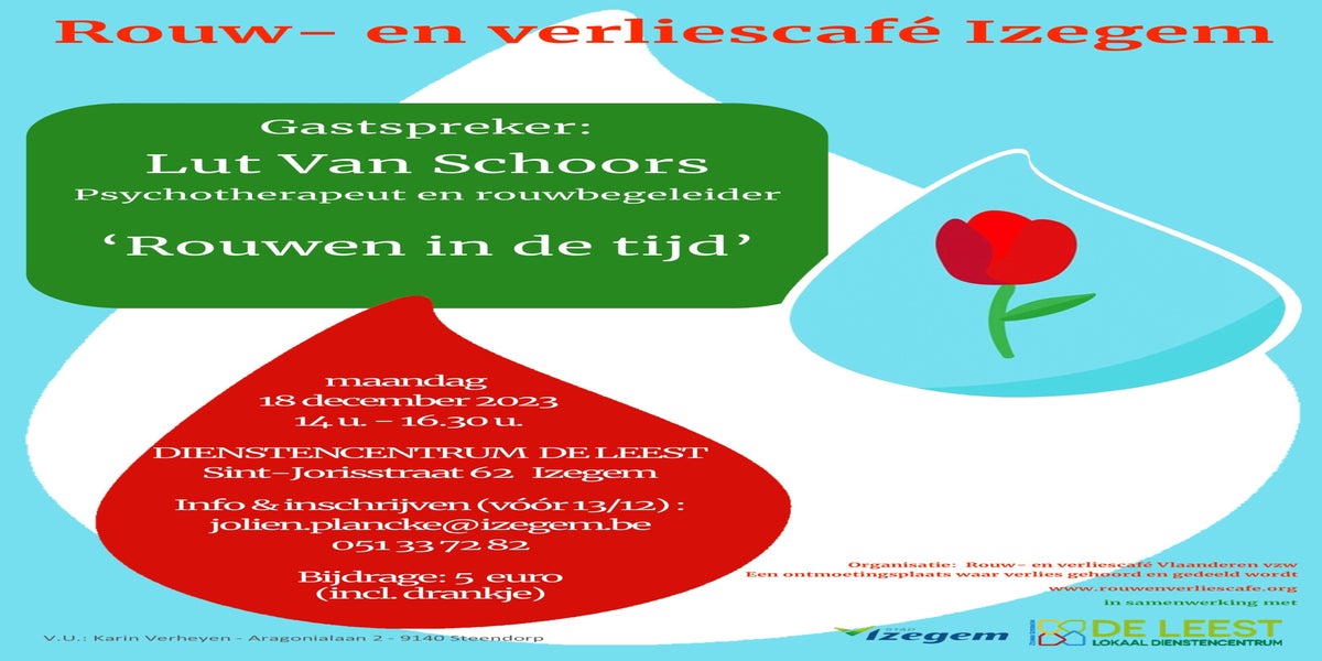 Lut Van Schoors, psychotherapeut en rouwbegeleider, leidde de namiddag in en sprak de aanwezigen over wat iemand die rouwt zoal meemaakt, terwijl die probeert weer grip te krijgen op de nieuwe situatie. En hoe mensen die rouwen een andere manier vinden om met het gemis om te gaan.